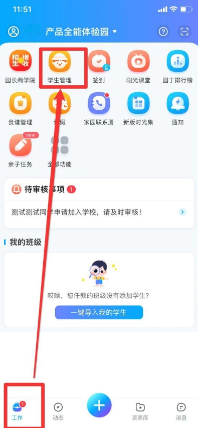 1、进入园丁端首页,点击底部或菜单中的【学生管理】功能模块。