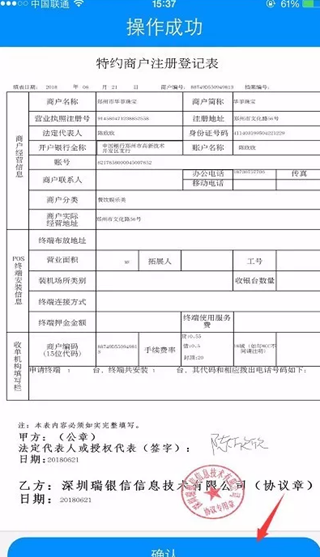 点过确认后商户就立马开通了,可以正常绑机使用,默认秒到额度2000。