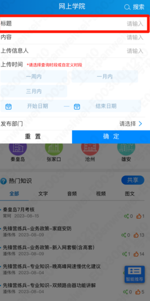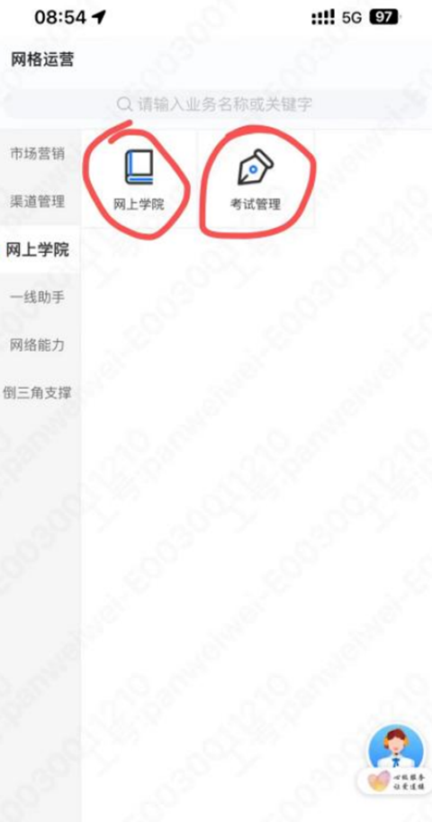 1、登录网格通APP后,点击下部的“网格运营”-网上学院,直接点击右上角搜索“先锋营”如图所示: