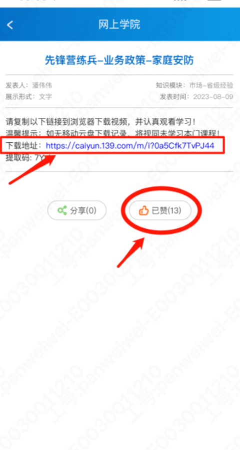 2、点击一条学习内容,点击下载链接下载观看学习,然后点赞,一定更要点赞记录学习过程。如图所示: