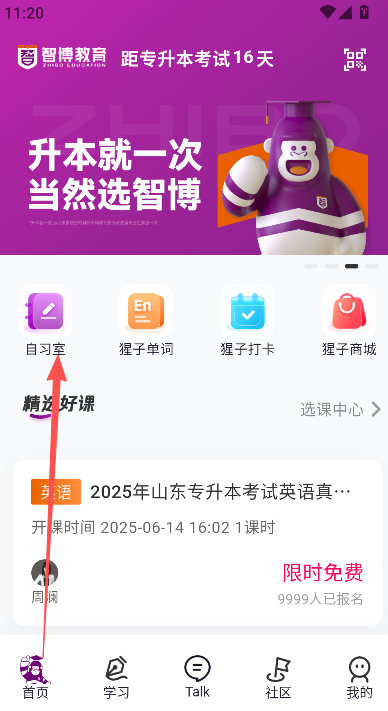 2、在首页点击自习室板块。
