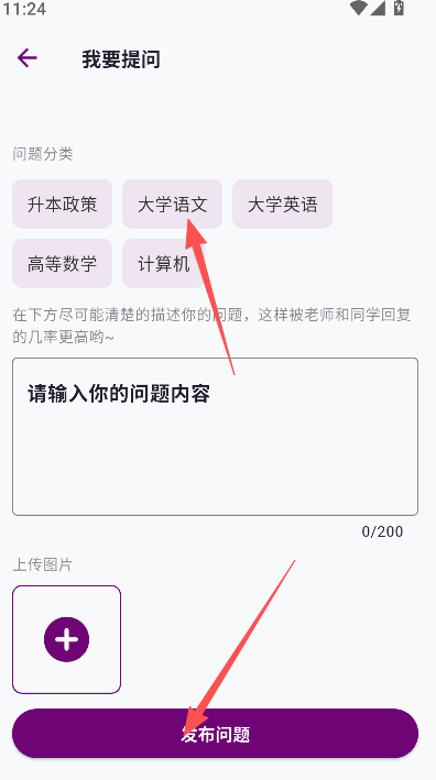 2、点击问题分类标签,然后输入问题内容并附上图片,完成后选择底部的发布。