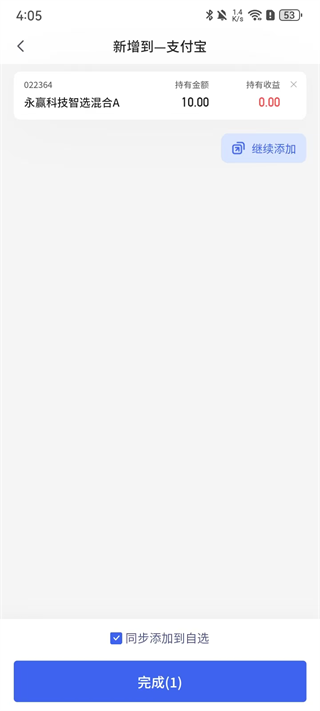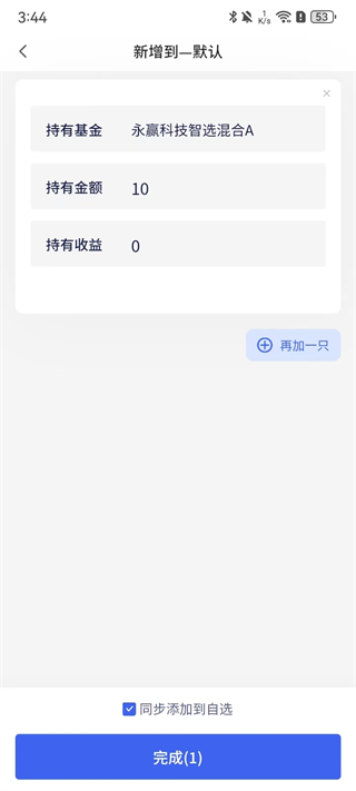 3、这里以手动方式为例,输入持有基金、金额、收益,勾选下方【同步添加到自选】并点击【完成】。