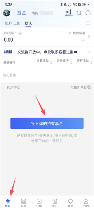 1、打开软件注册并登录后点击【持有】-【导入你的持有基金】。