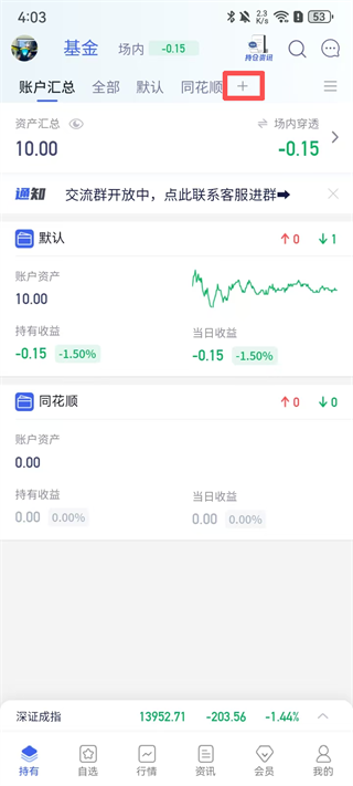 1、打开软件在持有页点击上方的【+】按钮。