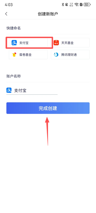2、创建新账户,选择【支付宝】点击【完成创建】。