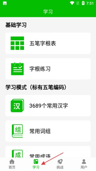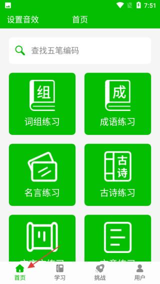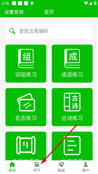 1、进入应用首页,可见查找五笔编码的搜索框,还有词组练习成语练习名言练习古诗练习等功能入口,点击底部学习选项,进入学习功能页面。