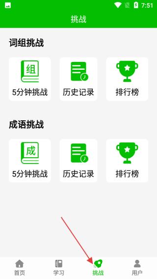 3、点击挑战页面含词组和成语挑战,限时5分钟,配有历史记录和排行榜,增添学习趣味性与竞技性。