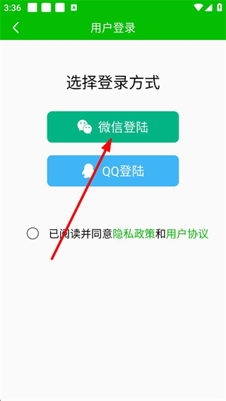 4、进入用户登录页面后,可选择微信登录或QQ登录的方式,需先勾选已阅读并同意隐私政策和用户协议,再进行对应方式的登录操作。