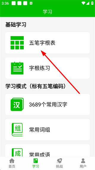 2、点击学习选项进入学习页面,能看到基础学习板块的五笔字根表字根练习选项,还有带五笔编码的学习模式板块,包含常用汉字等学习内容。