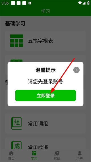 3、选择基础学习板块中的选项后,会弹出请先登录账号的温馨提示,点击提示里的立即登录按钮,即可进入用户登录的操作页面。