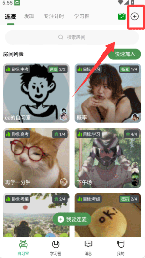 1、进入自习室页面:打开软件在首页选择自习室页面,点击右上角的加号标识。