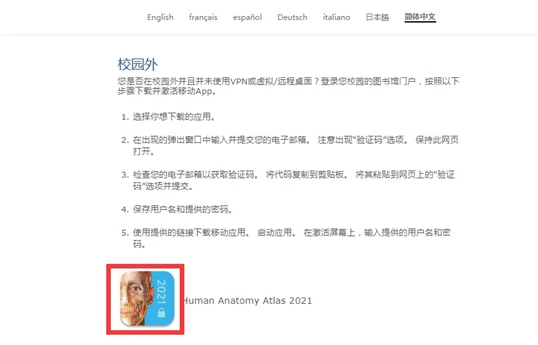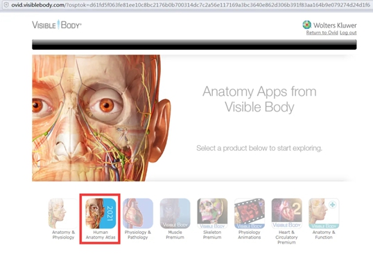 第二步:1.可打开访问链接,进入Visible Body Atlas网页 https://ovidsp.ovid.com/ovidweb.cgi?T=JS&CSC=Y&NEWS=n&PAGE=main&D=huaa212.可在图书馆主页-外文资源-Visible Body 人体解剖图谱(Atlas)机构版找到网页端链接;