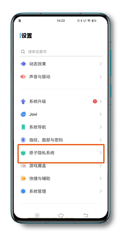 打开手机“设置”→“指纹、面部与密码”→“隐私与应用加密”→“原子隐私系统”。