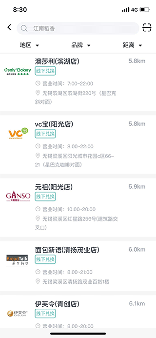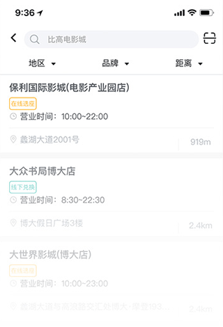 APP首页点击“电影选座”就可查看全部可兑换的门店,可在二级菜单选择地区/品牌/距离来进行筛选,或是直接输入品牌搜索。