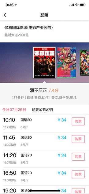 点击进入影院专属页面后,就可看到各影院的详细地址和上映的电影,点击相应的电影即可查看可在线选座的场次和价格,点击“购票”后进入选座页面,点击选择您的座位后确认选座,进入支付页面后可在支付方式内选择影币支付,即可完成选择购票。