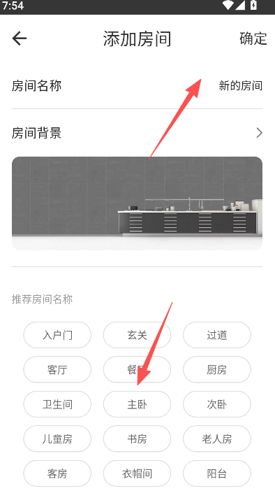 4、输入名称,并添加房间背景,点击右上方的确定。