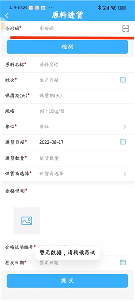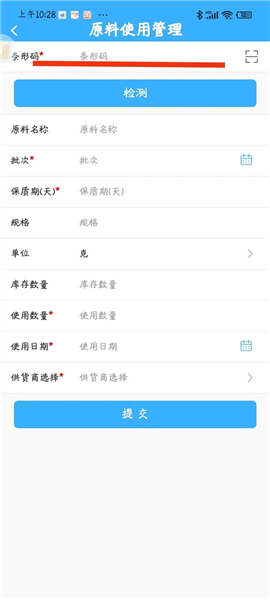 9、首先输入条形码,这里要输入的条形码,就是原料备案时编写的条形码,输入条形码后,其他项目内容会自动弹出,只需要填写购进数量等内容。产品生产所需要的原料必须分别进行“添加”,进行原料购进。 原料使用台账:原料购进后,进入企业库存,企业每次生产,根据需要使用原料,点击右上角“添加”,进行同样的操作,条形码只需要输入备案的原料的条形码,条形码不对,无法进行原料购进或使用。‘