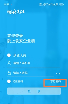 1、打开陇上食安商户端App,登录账号为商户注册时使用的手机号,若忘记密码可点击登录界面的“找回密码”按提示重置。