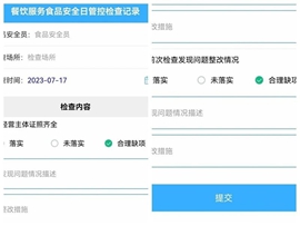 3、进入填写页面后,逐项录入日管控相关信息,确认无误后点击提交。其中“食品安全员”一栏需填写从业人员的姓名,“检查场所”则填写对应的店名。