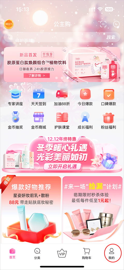 1、打开公主购APP,首页提供了众多方便使用的功能和各种大牌促销活动;