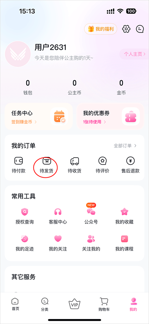 2、进入我的页面点击待发货按钮