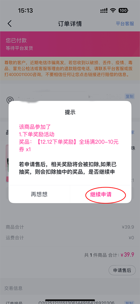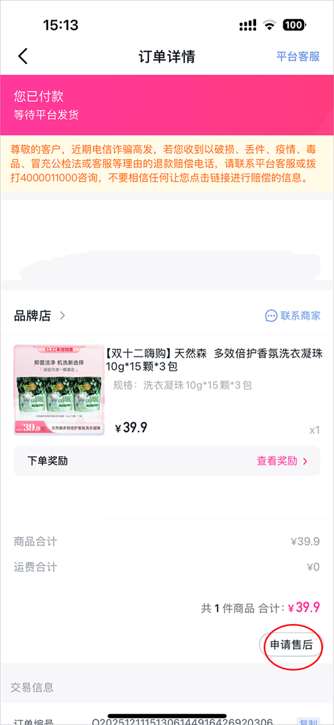 4、进入详情页面点击申请售后