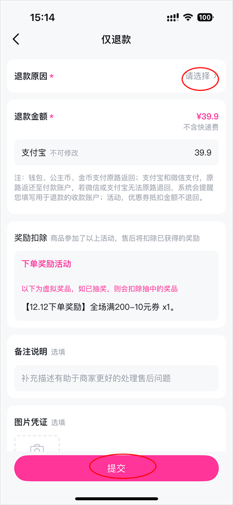 6、选择退款原因点击提交即可