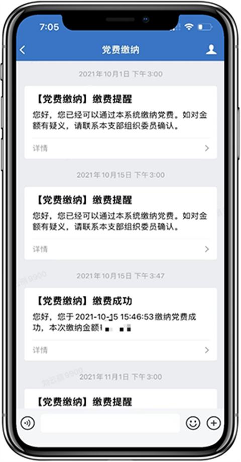 系统每月自动向未缴纳党费用户定时推送缴费提醒,同时支持管理员手动触发消息提醒。党员缴费后,系统自动推送缴费成功消息。