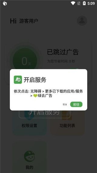 3. 操作简单,打开软件进入主页,点击开启服务按钮,按提示授予无障碍权限与通知使用权,就能完成基础授权,轻松开启广告屏蔽等功能。