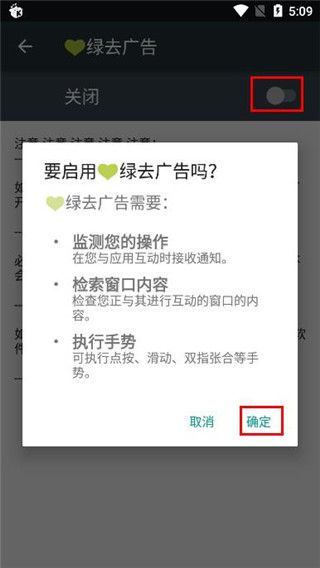 5、开启去广告,会显示需要开启的内容,直接点击确定