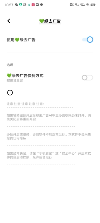 绿去广告是一款专为安卓用户精心打造的智能去广告工具,致力于彻底消除手机应用中的烦人广告干扰,显著提升设备运行效率与使用体验。通过先进的广告拦截技术,它能自动跳过应用开启页广告,智能识别并屏蔽恶意广告,有效加快应用启动速度,同时降低电量消耗,让您的手机运行更流畅、更省电。