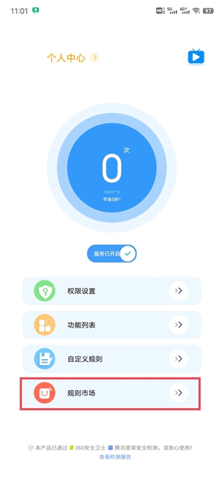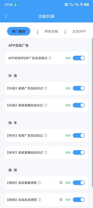 点击首页的功能列表,可以看到软件内置的去广告规则,如APP启动广告自动跳过,抖音快手视频广告自动划过,视频直播自动划过等等。
