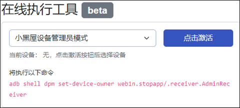5、打开Adb在线执行工具,选择小黑屋设备管理员模式,点击激活按钮并选择你的设备