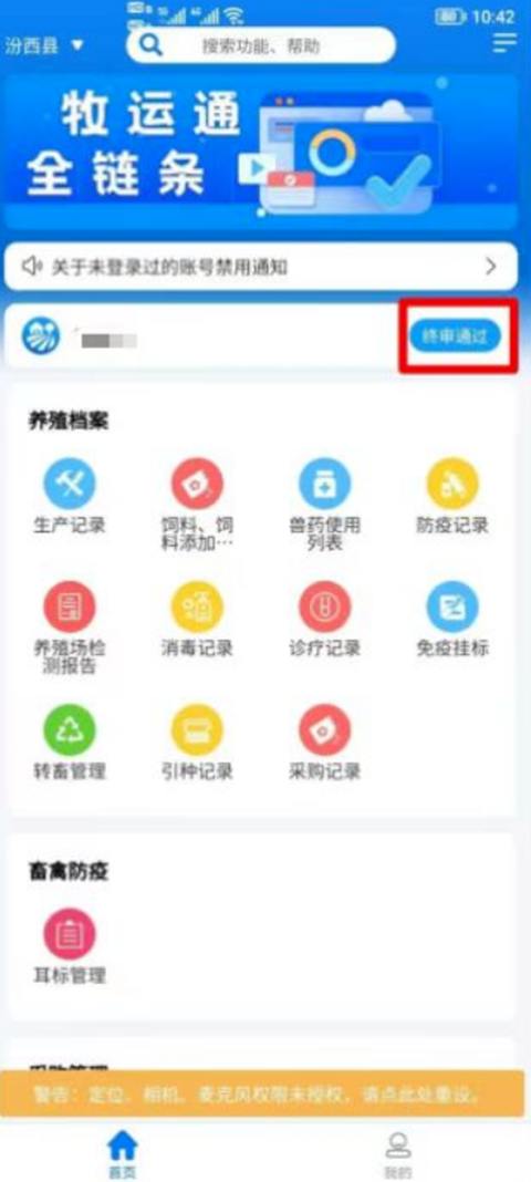 注册成功后,返回登录界面输入账号(手机号)、密码登陆系统。养殖场户登录系统后,系统自动检测养殖场户基本信息是否完善,不完善的提示养殖场户先完善基本信息,填写的信息必须是真实有效,符合实际情况。