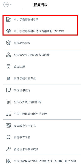 2、在服务列表中找到“中小学教师资格考试”“中小学教师资格证考试合格证明(NTCE)”并点击进入查询页面。