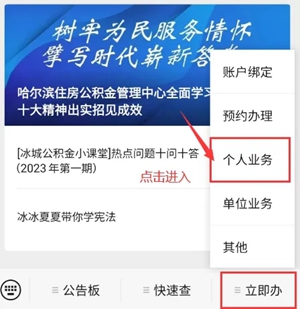 1、进入哈尔滨住房公积金管理中心微信公众号,点击右下角【立即办】进入菜单栏(未绑定用户需进行账户绑定)。