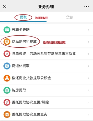 3、打开【提取业务】页面,点击相应的办理业务,例如【商品房房租提取】。