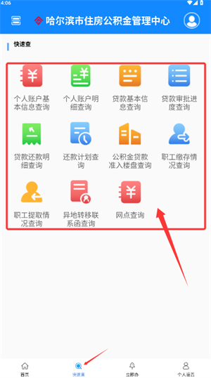 2、选择底部快速查询功能,可检索个人账户明细与贷款信息等多项内容。