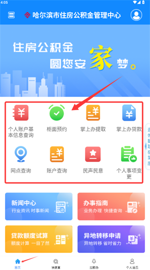1. 启动程序后,首页能看到账户基本信息查询、柜面业务预约等公积金功能入口,方便又直观。