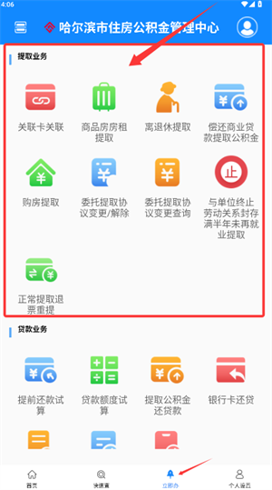 3. 进入在线办理界面,支持关联卡绑定、租房提取及贷款申请等业务操作,办理业务超便捷。