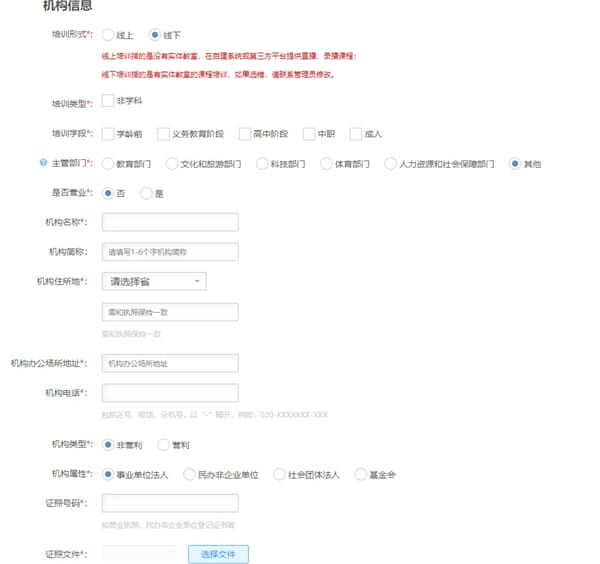 4、接下来用户需要完善机构信息,填写关于机构的培训形式,培训类型,主管部门等基本信息。