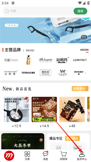 1、打开美信优选商城,在“会员中心”一栏找到并点击“积分商城”按键;