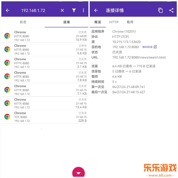 左图通过搜索框过滤特定目标主机,可以看到这些连接目前已经是关闭状态(CLOSED),因为用的是短连接场景;任意点选一个连接可以看到概览信息,包括连接持续时间,访问的URL、协议、进程APP和进程ID,以及产生的流量大小和载荷长度: