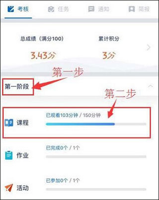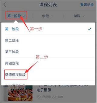 3、第一步先选择阶段,第二步点击阶段里的课程;