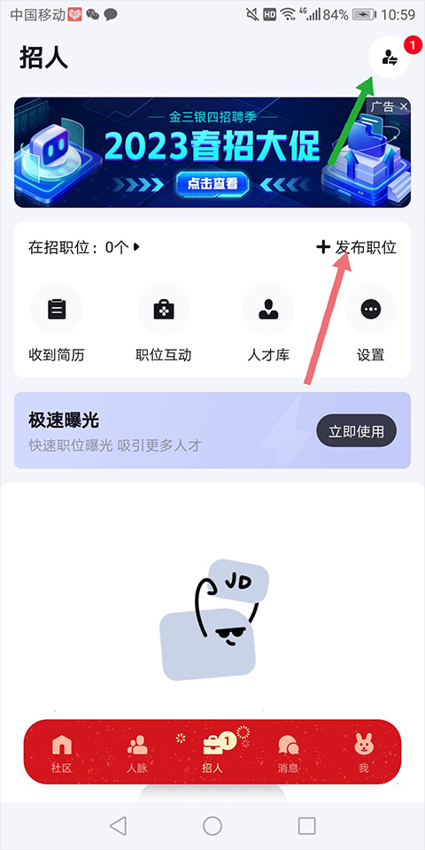 1、用户打开并登录脉脉app,进入【招人】页面中点击右上角的人设切换按钮(下图绿色箭头所指),在打开的新页面点击【发布职位】(下图红色箭头所指)