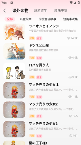 文章读物:分为课外读物、考试留学、趣味干货三个大类,配合日语和译文,满足日语初学者阅读需求