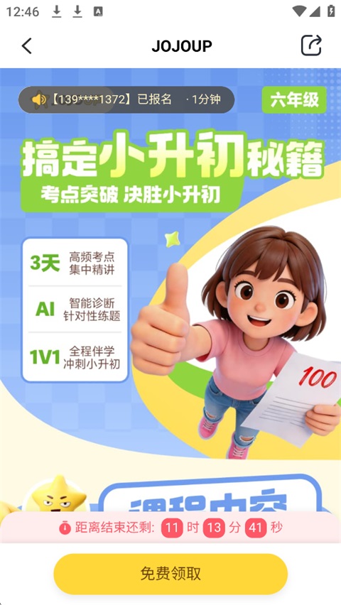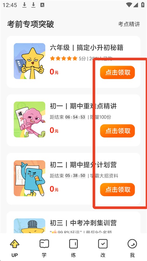 1、打开【UP】页面,可以领取免费的六年级到初三的课程。