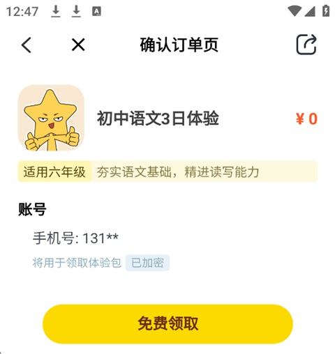 3、页面跳转后,确认电话号码,点击【免费领取】即可领取课程。