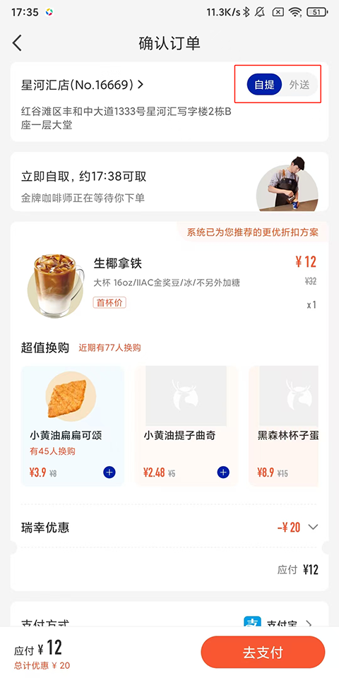 2、择你喜欢的饮品,点击“去结算”按钮,并决定是自提还是外送。你还可以选择取单地址和时间。